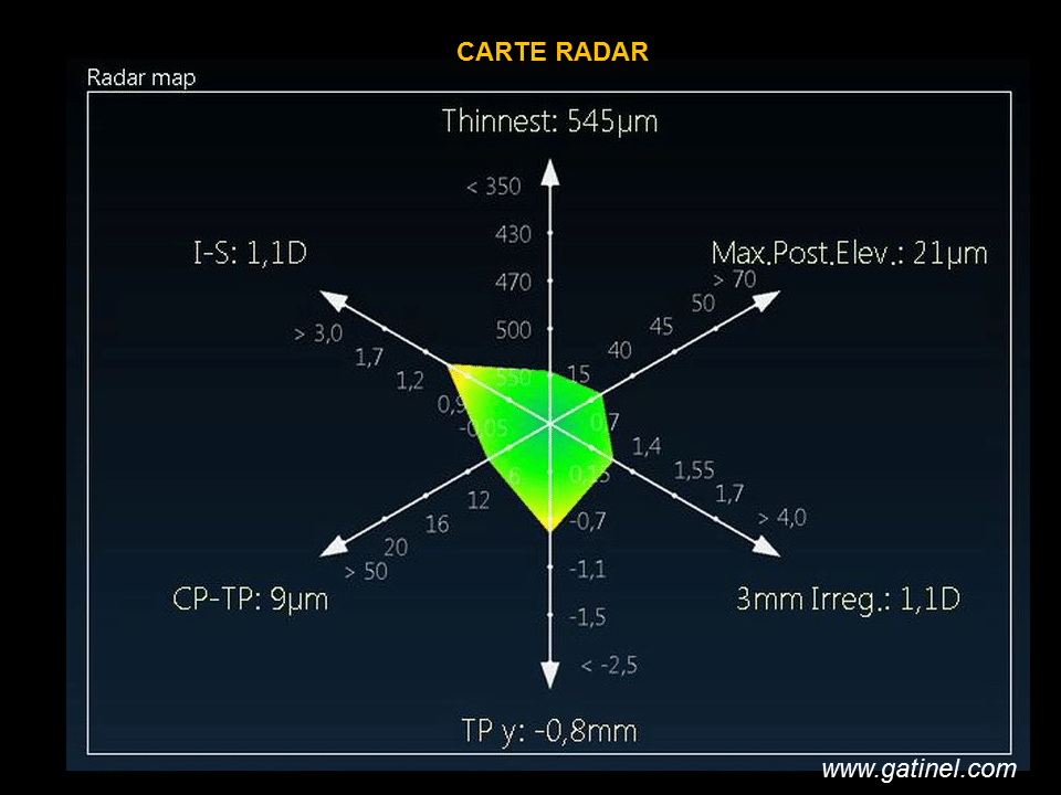 La valeur absolue de cette valeur (sa « distance » avec le seuil) est indicative du caractère « normal » ou « anormal » de la cornée analysée. La réalisation d’une chirurgie réfractive cornéenne de type LASIK est déconseillée en cas de valeur positive.