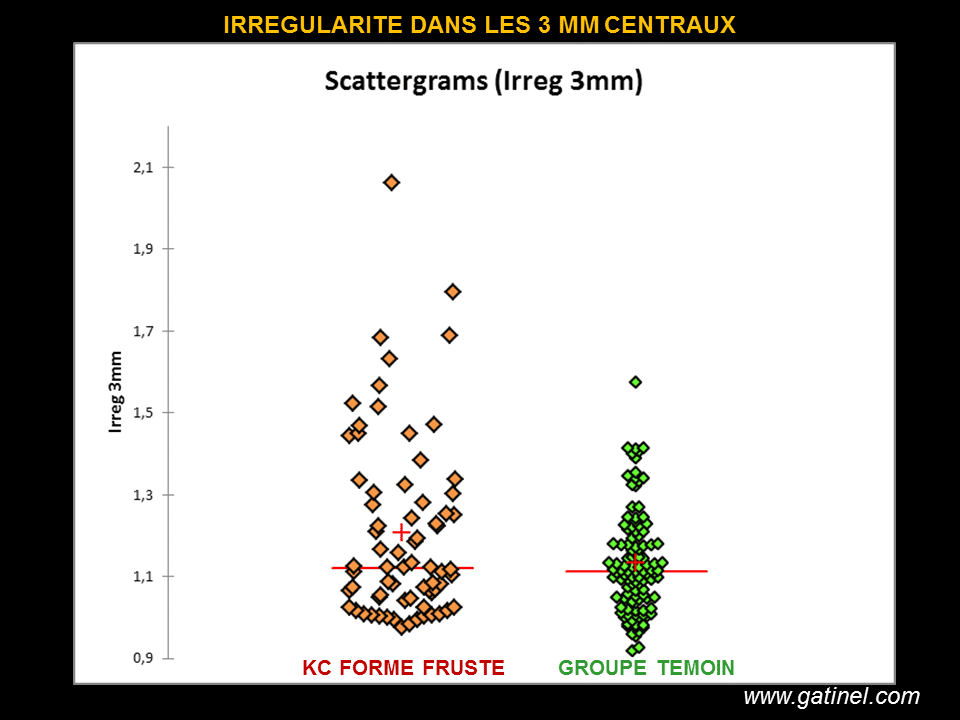 D’autres paramètres présentaient des différences statistiquement significatives entre les deux groupes: l’épaisseur centrale moyenne était réduite (524.3+/-35 vs 554.6+/-36 microns), la différence entre cette valeur et celle du point le plus fin (thinnest point) était augmentée (12.1+/-5 .6 vs 6.8+/-3.1 microns), la distance avec le centre géométrique du point le plus fin était augmentée (0.95+/-0.37 vs 0.64+/-0.32), et la valeur d’élévation postérieure vis à vis de la sphère de référence calculée après recentrement sur le point le plus fin était plus grande en regard de ce point (26.3+/-11 microns vs 19.7+/-8.6 microns).