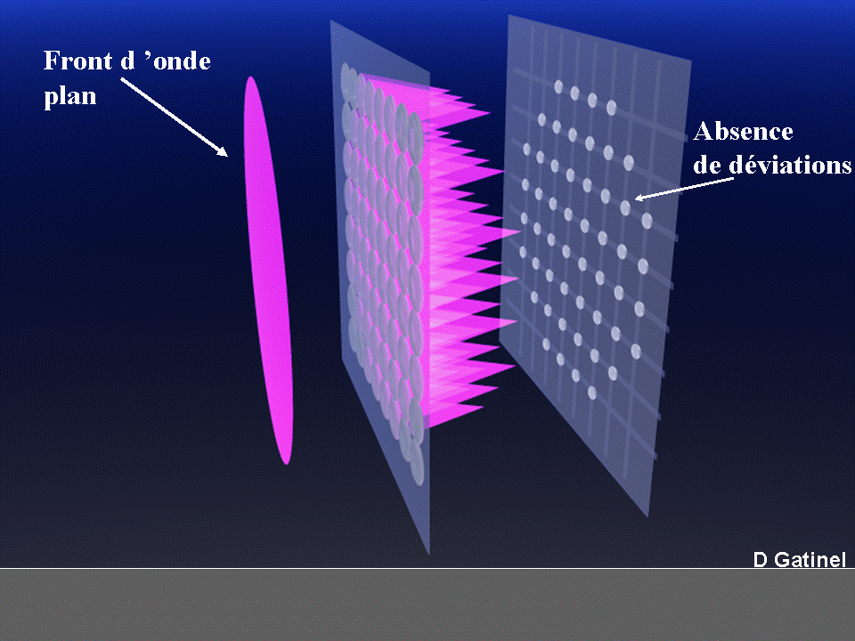 Aucune déviation n’est détectée par le réseau de microlentilles, chaque portion de ce « front d’onde » idéal à la sortie de l’oeil étant parallèle au plan de la microlentille. Il n’y a pas de différence de chemin optique pour tous les points de la pupille.
