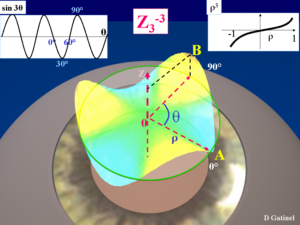 Selon le degré, elles présentent une symétrie axiale (degrés pairs) ou non (degrés impairs). Elles traduisent l’existence d’imperfections optiques multiples non systématisées qui exercent un effet particulier au niveau des bords du front d’onde.. Elles ont en général une faible incidence sur la fonction visuelle sauf quand leur taux est particulièrement élevé (comme au décours d’une cicatrisation cornéenne irrégulière, d’une chirurgie incisionnelle ou d’une kératoplastie transfixiante).