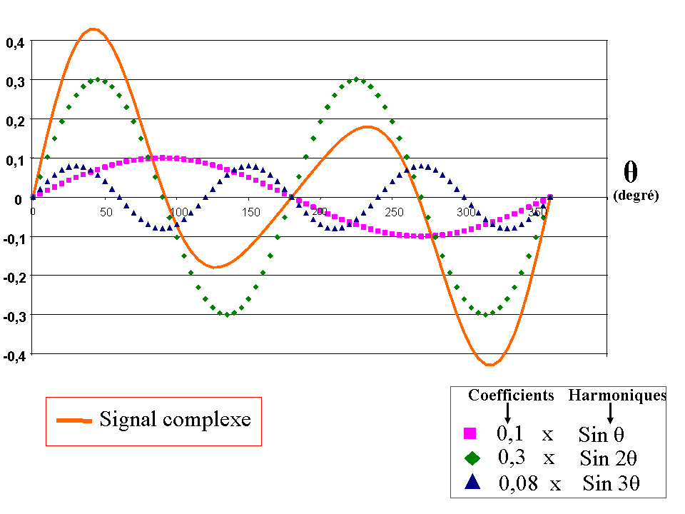 Principe de la décomposition d’un signal complexe en signaux élémentaires. Un signal complexe périodique peut être décomposé en harmoniques élémentaires affectées d’un coefficient particulier (décomposition spectrale). Dans cet exemple, trois harmoniques suffisent à la décomposition du signal complexe initial. L’addition de chacun de ces harmoniques permet de reconstituer le signal complexe : chaque harmonique est affectée d’un coefficient. Plus celui-ci est élevé, et plus son influence dans la forme du signal est importante (dans cet exemple, la forme globale du signal analysé est proche de l’harmonique (Sin 2θ). Ce type de décomposition en fonction sinusoïdale de fréquences croissantes (θ, 2θ, 3θ…) correspond à l’analyse de Fourier, qui vise à déterminer la valeur des coefficients à affecter à chacune des harmonique afin de reconstituer le signal initial par sommation. En général, plus le signal est complexe, et plus le nombre de signaux élémentaires nécessaires à sa description est élevé. Le principe utilisé pour la décomposition en polynômes de Zernike d’une surface telle que l’enveloppe d’un front d’onde est similaire. Chaque polynôme de Zernike peut être considéré comme une harmonique; l’analyse du front d’onde est effectuée en calculant la valeur du coefficient attribué à chacun des polynômes.