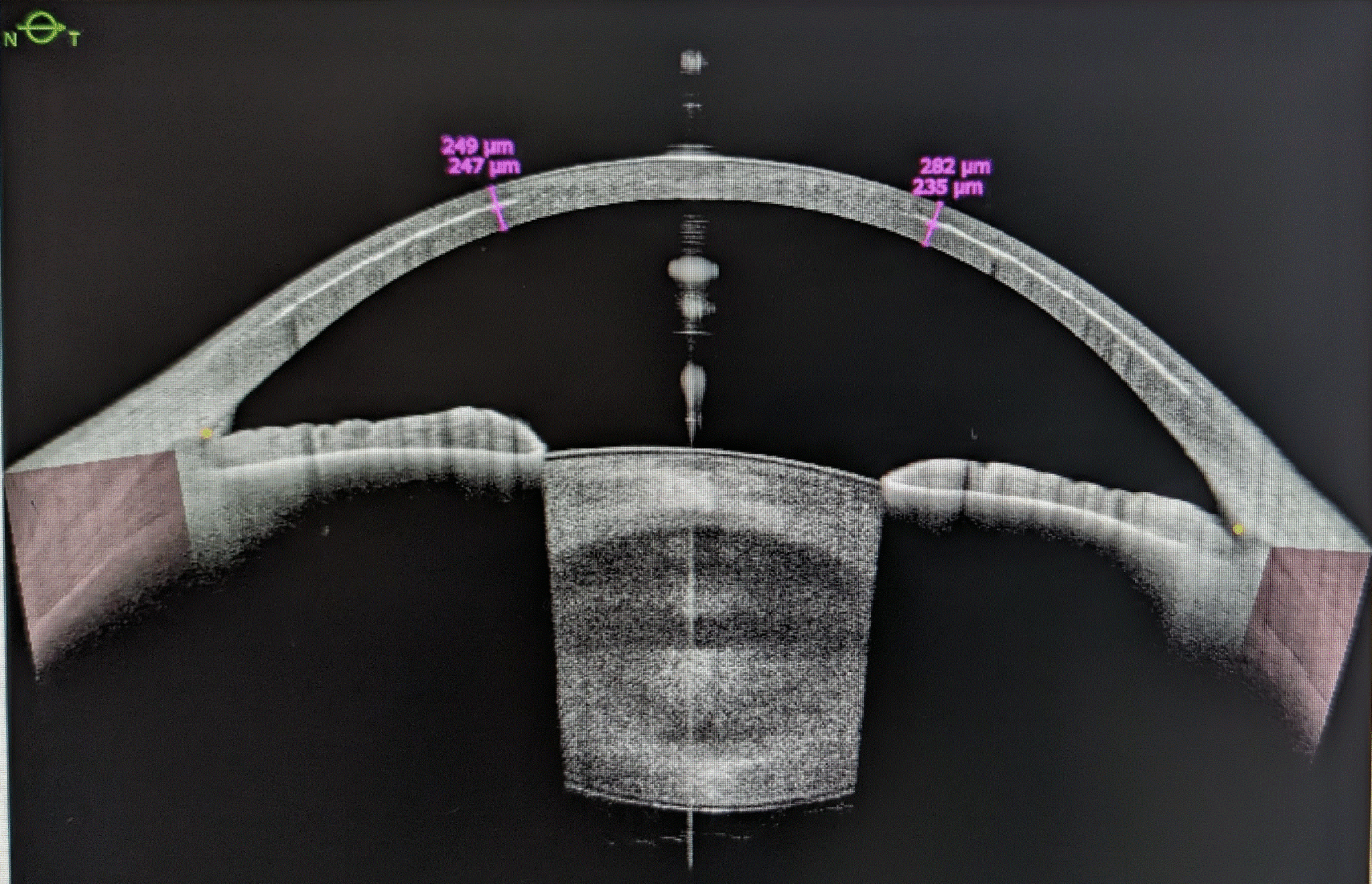 Aspect au biomicroscope; On visualise le chenal réalisé pour accérer au tunnel périphérique à 6h / 12h.
