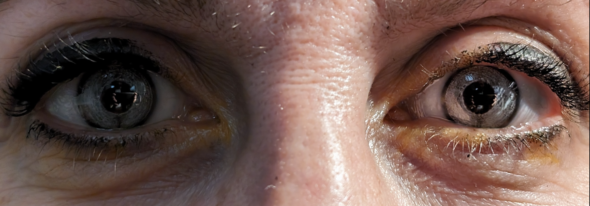 Exemple d’hétérochromie irienne: dans cet exemple, les deux yeux étaient initialement de la même teinte (celle de l’œil droit de la patiente). Cette teinte était vert avec une coloration plus brune vers la pupille (due à une proportion croissante de pigment mélanocytaire du feuillet antérieur de l’iris en allant vers le bord pupillaire). Une pathologie appelée cyclite (ou uvéite) de Fuchs est apparue: cette pathologie dont l’origine exacte est inconnue est caractérisée par la présence d’une inflammation de l’œil, plus précisément du tissu uvéal. L’inflammation prolongée est responsable d’une disparition progressive des mélanocytes et du pigment irien. L’iris prend alors une teinte bleutée.