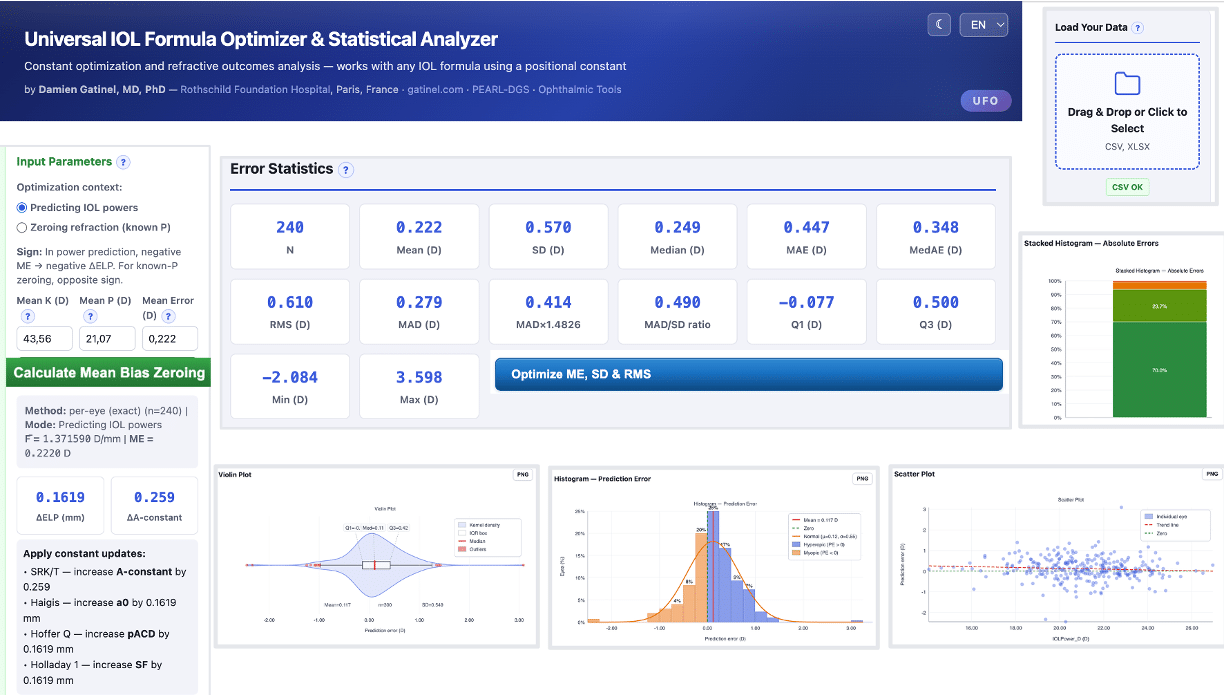 Whether you are a high-volume cataract surgeon looking to fine-tune your preferred formula, a clinical researcher preparing a comparative IOL power formula study, or a fellow learning refractive outcomes analysis — this tool delivers publication-grade analytics in seconds, at no cost. It is intended as a research, clinical decision-support, and teaching tool for ophthalmologists involved in cataract and refractive lens surgery.